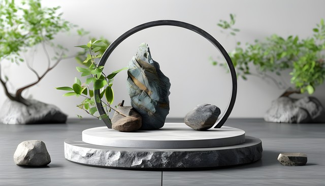 石材平台上摆放着自然元素,展示和谐美丽的室内景观。
