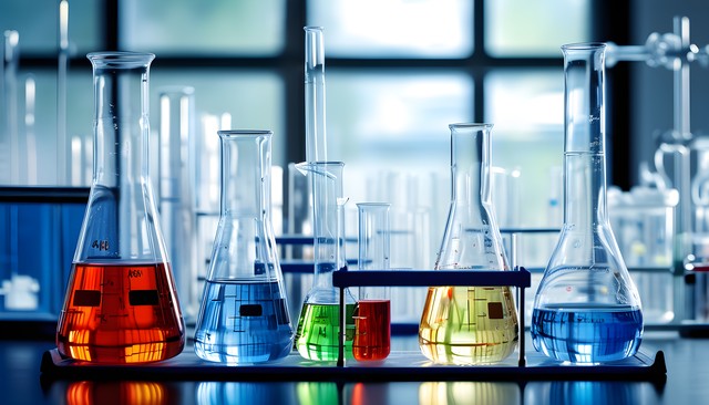 实验室中五个不同形状的烧瓶,内含蓝色液体,透出科技感。