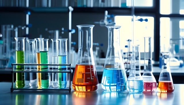 实验室中五个不同形状的烧瓶,内含蓝色液体,透出科技感。
