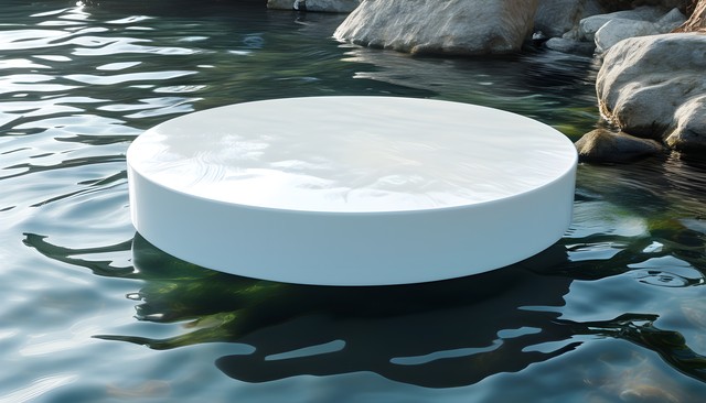 水面上的白色圆形物体,周围是石头和植物,展现出静谧的自然景象。
