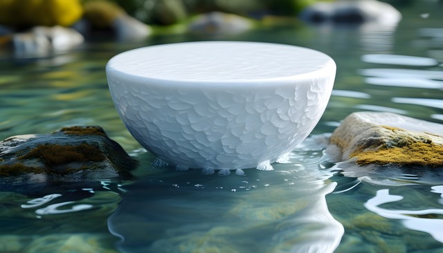 水面上的白色圆形物体,周围是石头和植物,展现出静谧的自然景象。