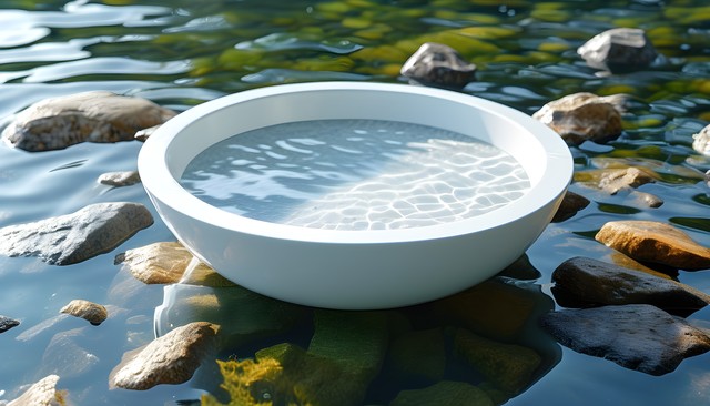 水面上的白色圆形物体,周围是石头和植物,展现出静谧的自然景象。