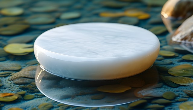 水面上的白色圆形物体,周围是石头和植物,展现出静谧的自然景象。