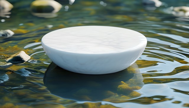 水面上的白色圆形物体,周围是石头和植物,展现出静谧的自然景象。