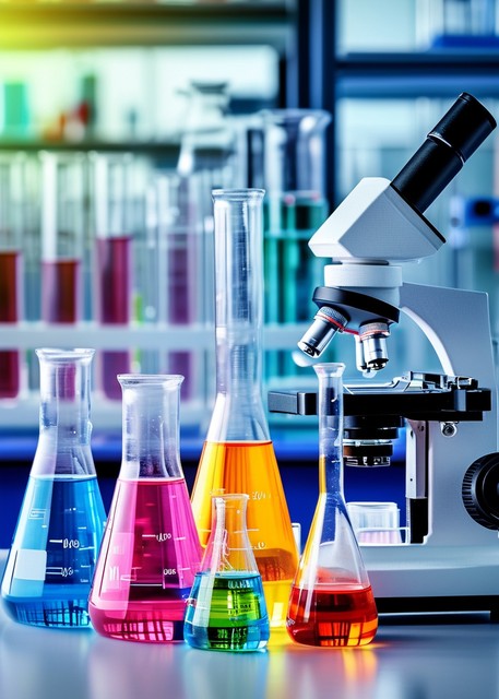 实验室中五彩缤纷的试剂瓶与显微镜,展现科学探索的魅力。