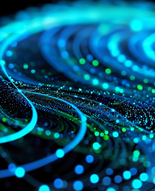 抽象圆点线条图案旋转蓝色绿光孤立在黑色背景中的音乐、技术、数字概念
