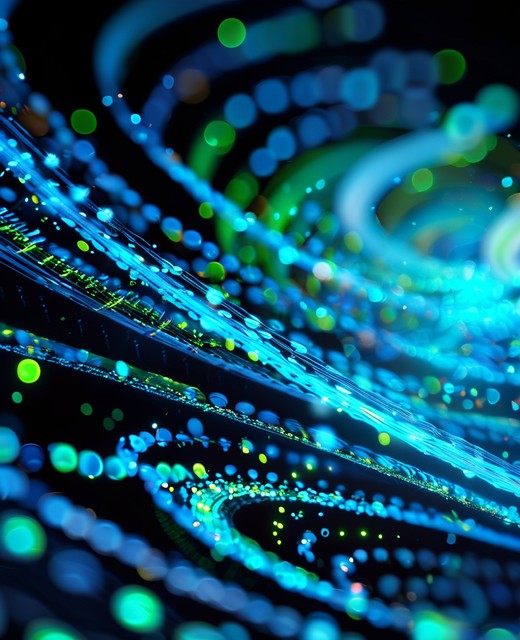 抽象圆点线条图案旋转蓝色绿光孤立在黑色背景中的音乐、技术、数字概念