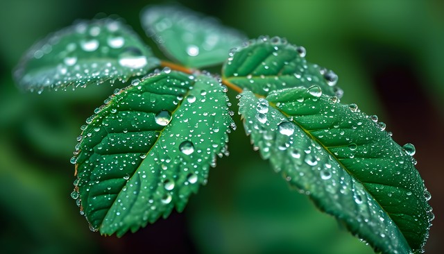 清晨露珠覆盖的绿叶,展现出自然的生机与美丽。