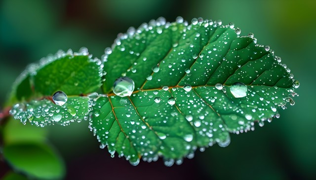 清晨露珠覆盖的绿叶,展现出自然的生机与美丽。