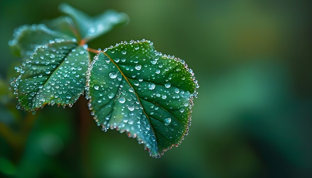 清晨露珠覆盖的绿叶,展现出自然的生机与美丽。