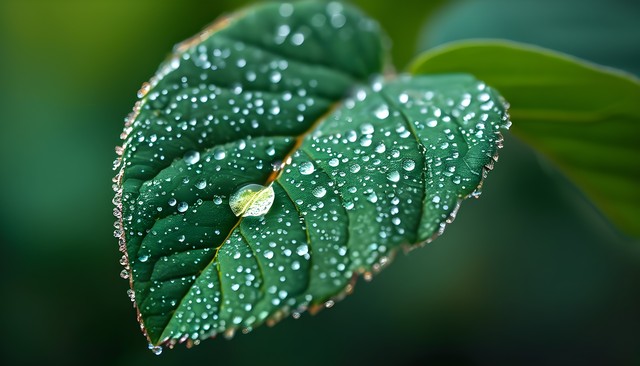 清晨露珠覆盖的绿叶,展现出自然的生机与美丽。