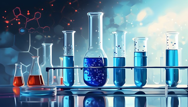 实验室中盛满蓝色液体的试管和烧瓶,与泡泡效果互动,背景模糊