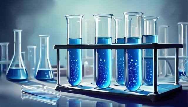 实验室中盛满蓝色液体的试管和烧瓶,与泡泡效果互动,背景模糊
