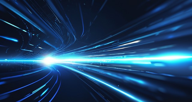 矢量抽象、科学、未来、能源技术概念。 深蓝色背景上的光线、蓝光条纹、速度和运动模糊的数字图像