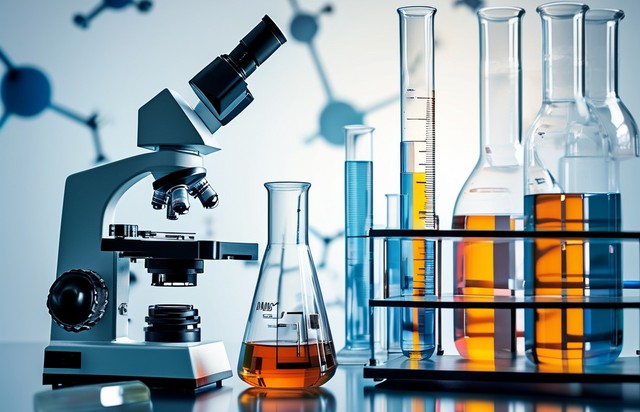 用于研究和分析的装有化学液体的显微镜和实验室玻璃器皿。用于研究和学生学习的实验室设备。