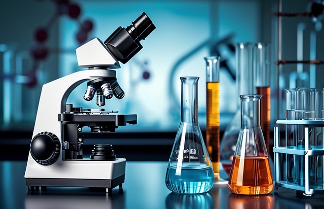 用于研究和分析的装有化学液体的显微镜和实验室玻璃器皿。用于研究和学生学习的实验室设备。