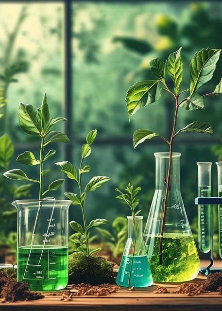以玻璃器皿、植物和环保技术为特色的实验室环境中绿色创新的可持续生态友好科学概念插图