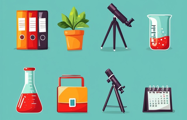 设置线标记笔、办公室文件夹、望远镜、盆栽、试管和烧瓶、秒表、日历九月一日和台灯图标。矢量