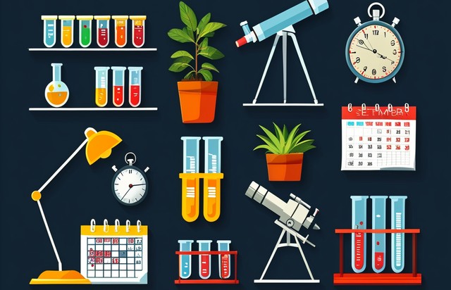 设置线标记笔、办公室文件夹、望远镜、盆栽、试管和烧瓶、秒表、日历九月一日和台灯图标。矢量