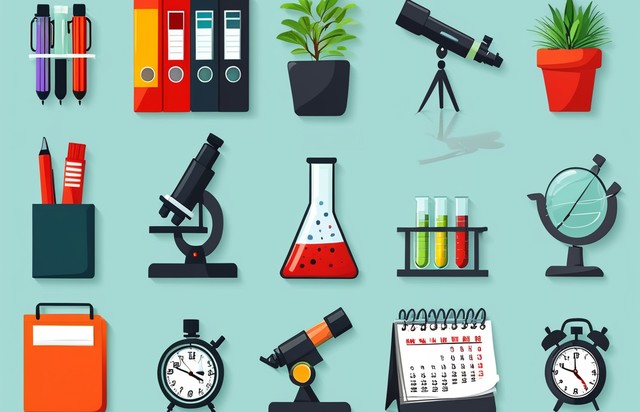 设置线标记笔、办公室文件夹、望远镜、盆栽、试管和烧瓶、秒表、日历九月一日和台灯图标。矢量