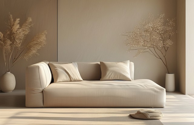 简约现代的室内环境,温暖的米色调,舒适的沙发和自然元素。