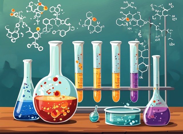圆形和平底烧瓶,装有溶液和试剂的试管。化学反应。化学、生物技术、生物学主题插图。
