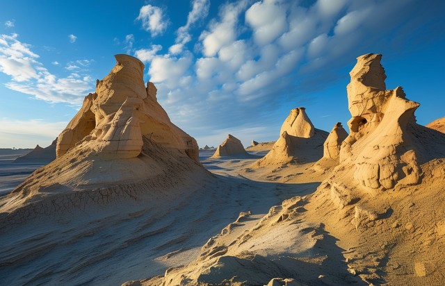 新疆乌尔禾的魔鬼城历经亿万年的风雨剥蚀,大自然的鬼斧神工形成了千奇百怪、形象各异的风蚀地貌。