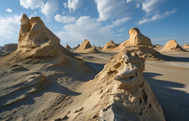 新疆乌尔禾的魔鬼城历经亿万年的风雨剥蚀,大自然的鬼斧神工形成了千奇百怪、形象各异的风蚀地貌。