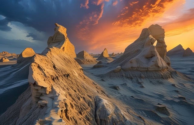 新疆乌尔禾的魔鬼城历经亿万年的风雨剥蚀,大自然的鬼斧神工形成了千奇百怪、形象各异的风蚀地貌。