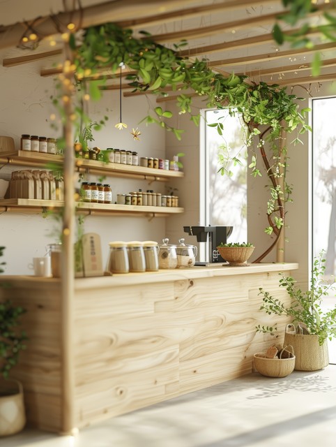 一个宁静的空展台,配有浅色木元素和微妙的绿植,营造出自然的氛围。