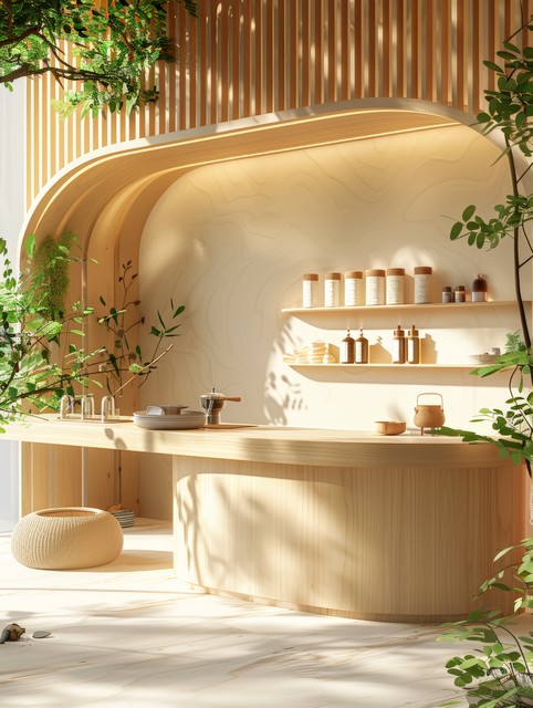 一个宁静的空展台,配有浅色木元素和微妙的绿植,营造出自然的氛围。