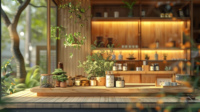 一个宁静的空展台,配有浅色木元素和微妙的绿植,营造出自然的氛围。