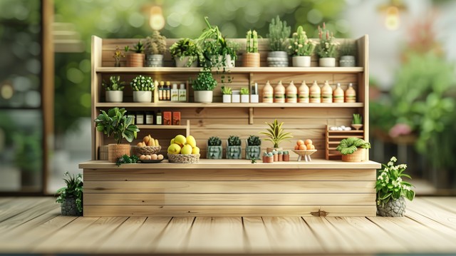 一个宁静的空展台,配有浅色木元素和微妙的绿植,营造出自然的氛围。