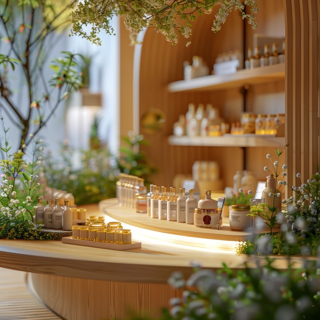 一个宁静的空展台,配有浅色木元素和微妙的绿植,营造出自然的氛围。