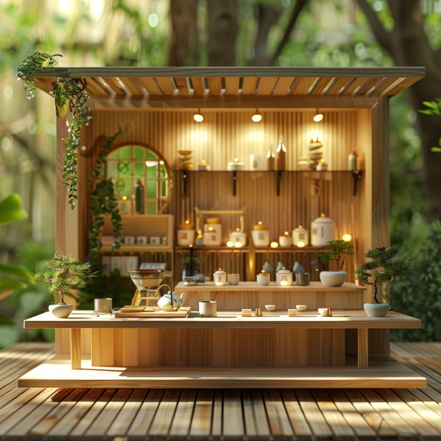 一个宁静的空展台,配有浅色木元素和微妙的绿植,营造出自然的氛围。