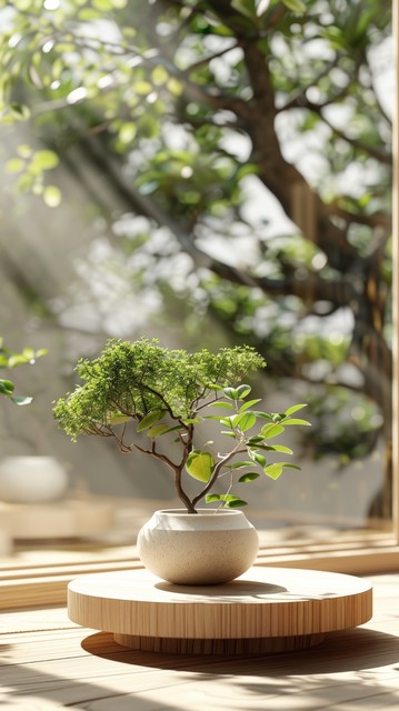 一个宁静的空展台,配有浅色木元素和微妙的绿植,营造出自然的氛围。