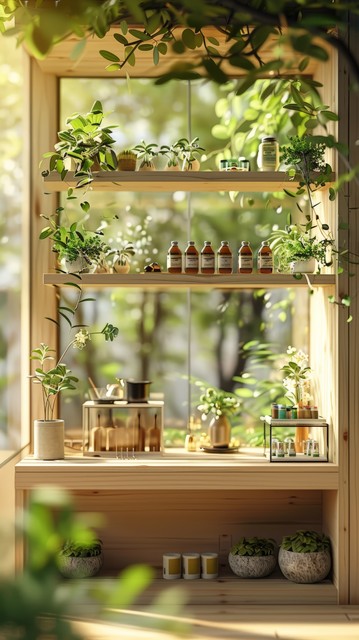 一个宁静的空展台,配有浅色木元素和微妙的绿植,营造出自然的氛围。