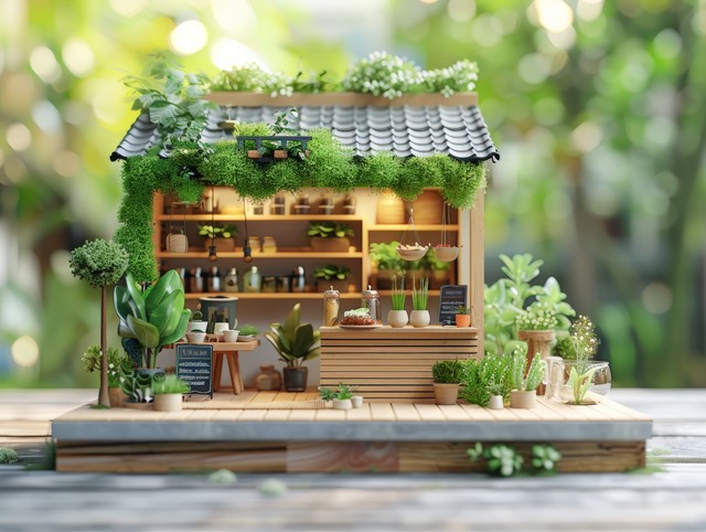 一个宁静的空展台,配有浅色木元素和微妙的绿植,营造出自然的氛围。