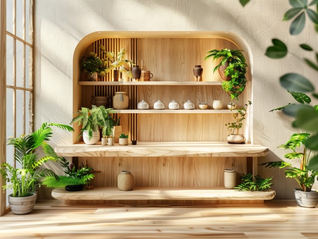 一个宁静的空展台,配有浅色木元素和微妙的绿植,营造出自然的氛围。
