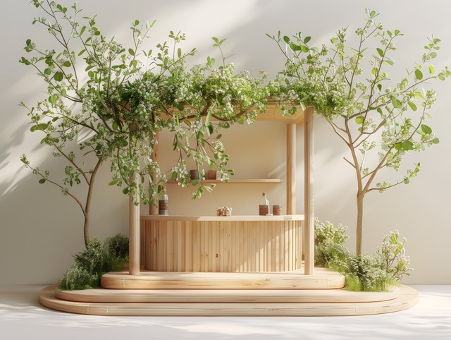 一个宁静的空展台,配有浅色木元素和微妙的绿植,营造出自然的氛围。