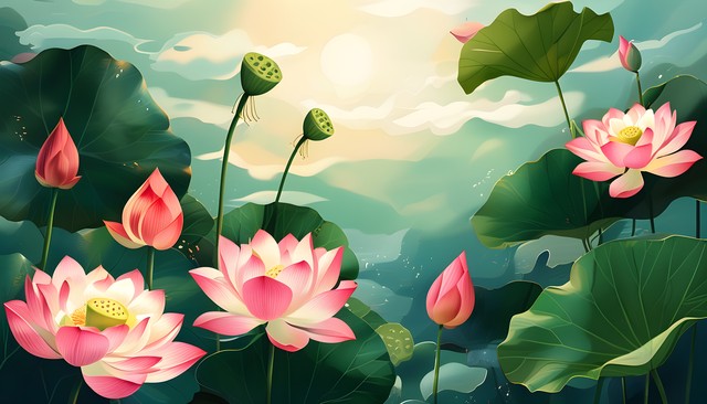 盛开的荷花与初升的太阳,构成一幅宁静的自然画卷。