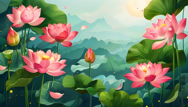 盛开的荷花与初升的太阳,构成一幅宁静的自然画卷。