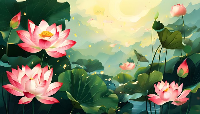 盛开的荷花与初升的太阳,构成一幅宁静的自然画卷。