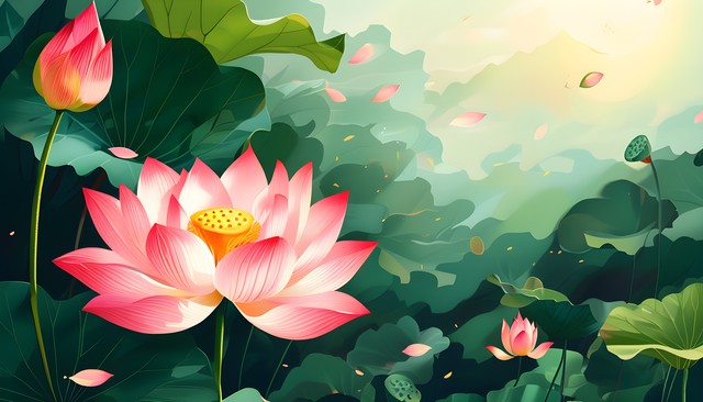 盛开的荷花与初升的太阳,构成一幅宁静的自然画卷。