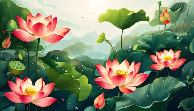 盛开的荷花与初升的太阳,构成一幅宁静的自然画卷。