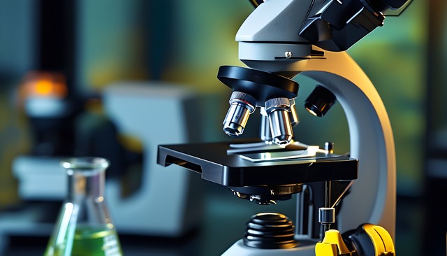 显微镜与模糊的实验室背景,展示科学探索的工具与色彩的结合。