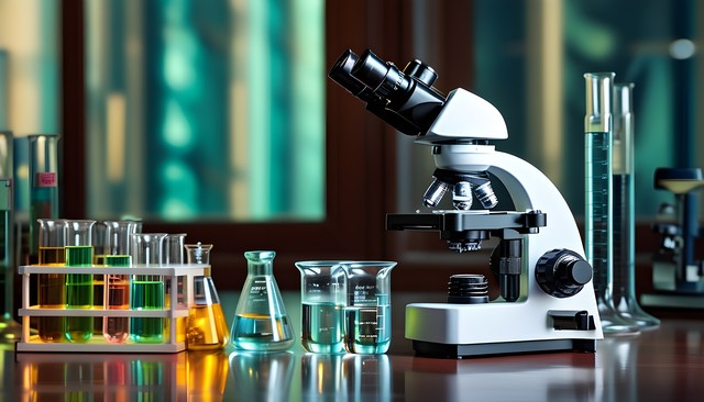 显微镜与模糊的实验室背景,展示科学探索的工具与色彩的结合。