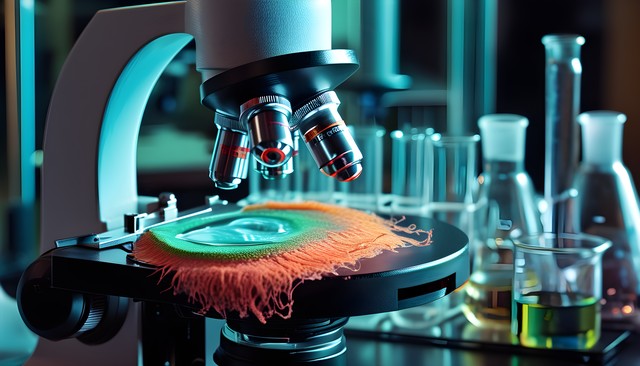 显微镜与模糊的实验室背景,展示科学探索的工具与色彩的结合。