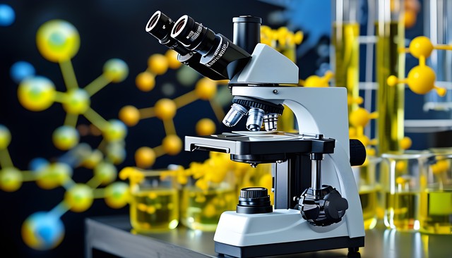 显微镜与模糊的实验室背景,展示科学探索的工具与色彩的结合。