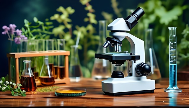 显微镜与模糊的实验室背景,展示科学探索的工具与色彩的结合。